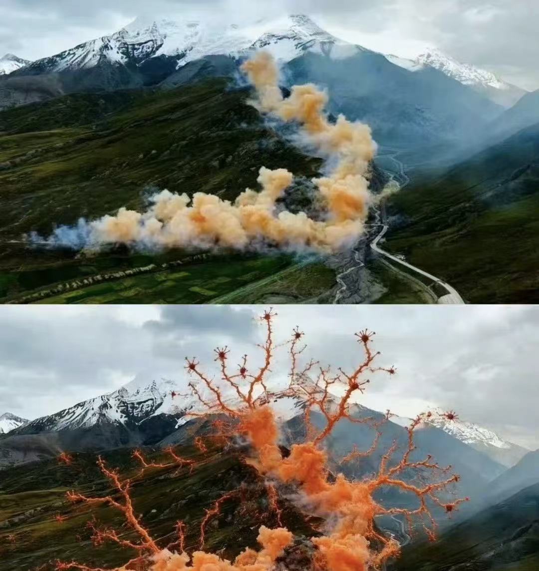 这场争议性的艺术活动位于西藏喜马拉雅山脉江孜热龙地区,海拔高达5500米。艺术家蔡国强通过火药爆破在山脊点燃三幕烟花,试图形成“升龙”动态景观。