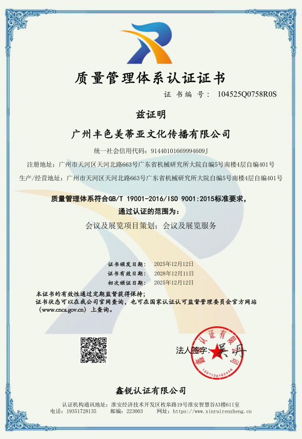 未来,丰色美蒂亚将以此次认证为新的起点,持续优化管理体系,深化专业能力,致力于为客户创造更大价值,推动企业和行业实现更高质量、更可持续的发展继续拼搏。